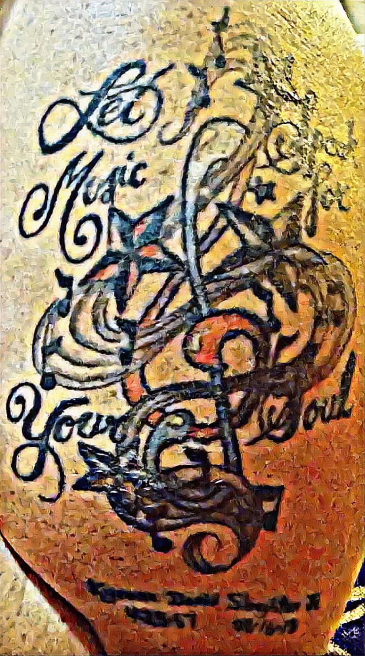 My 18th birthday was coming up, and my boyfriend told me he would pay for my first tattoo. I wanted something important to me, something that no one else had, and something music-related. I can't draw to save my life, but I slow sketched out a large G note with stars and other notes around it. On top of the tattoo is a saying I live by, "Let music speak for your soul." In 2013 when My boyfriend passed away unexpectedly, I added his name and information added under it across the bottom.