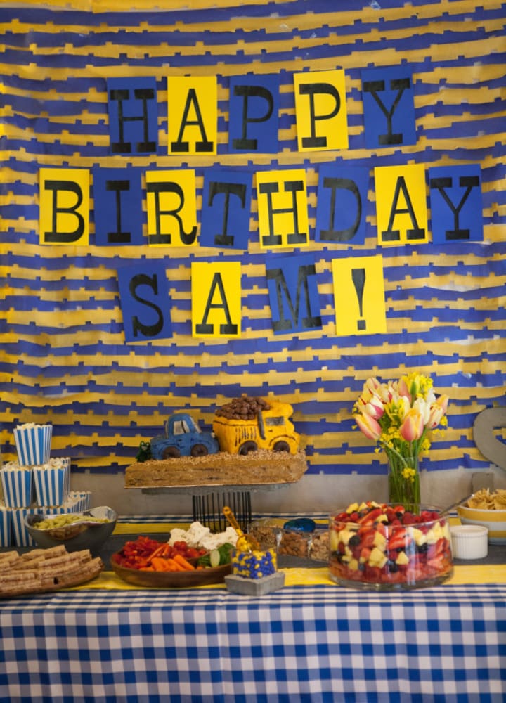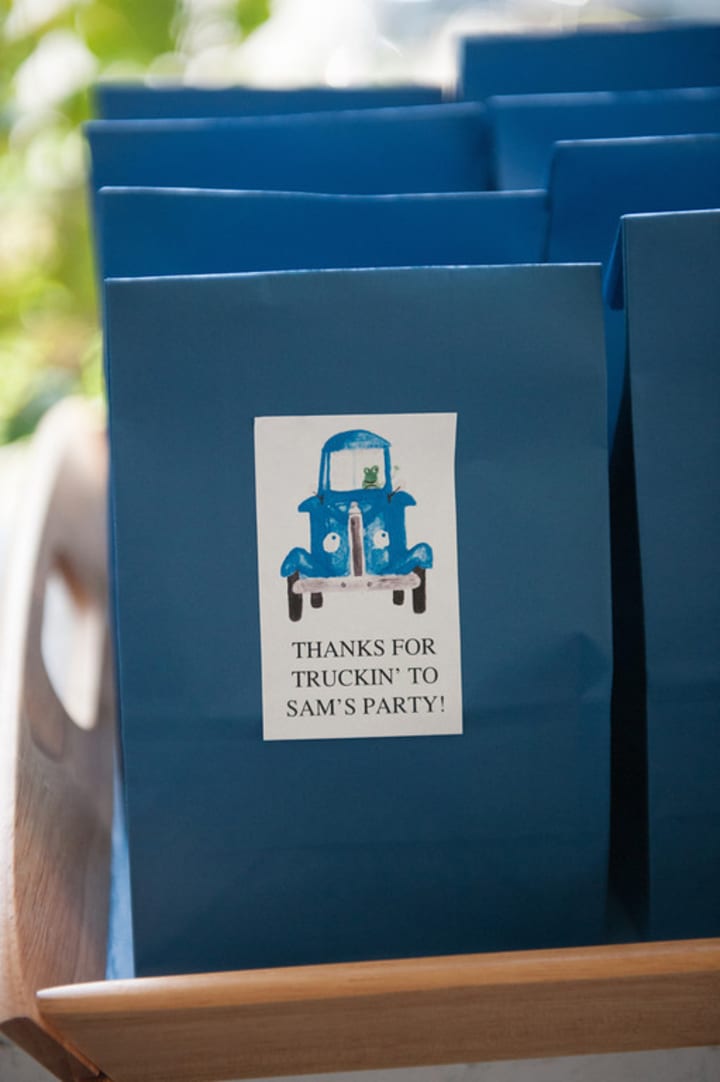 Favors – I found some sippy cups that had removable inserts for inserting your own images. I created a little cup wrap (that didn’t fit properly but I didn’t have the time to actually create a print that fit the curve of the cup) with the truck image I painted and a cheesy cute little phrase on the side. For favor bags, I cut the tops off of some blue gift bags using scissors that had the tire tread pattern on them. The bags were filled with a bendy farm animal, a flying frog, and a plain wood truck. I added a sticker to the bag with the truck image and “Thanks for truckin’ to the party!” on it.