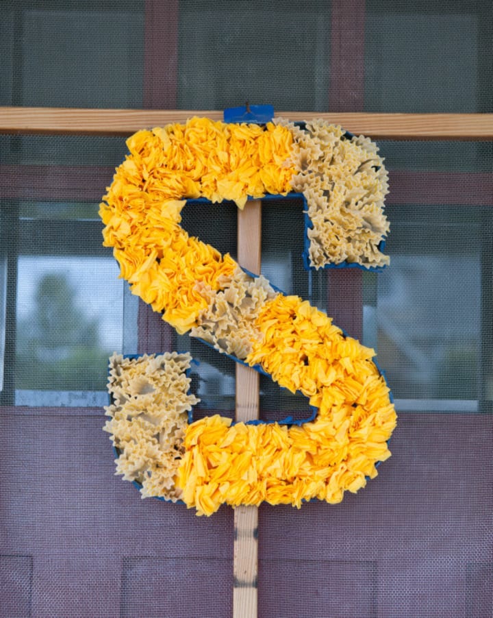 Backdrop – I cut blue and yellow crepe paper strips into a tire tread pattern. I taped them onto a drop cloth tablecloth and hung it from the wall. The words were just giant size P.T. Barnum letters cut out and taped to regular card stock. I taped the letters straight to the crepe paper.