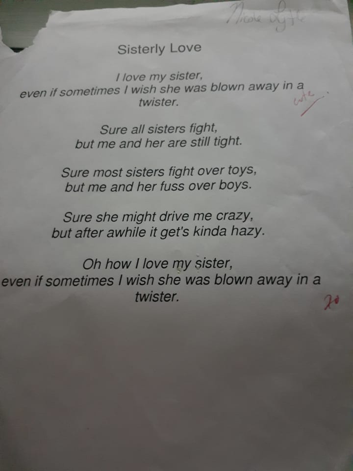 Thank you for being a big pain in my butt but also for always being there for me. Thank you for laughing at my jokes, even though I know they are not funny. Thank you for being my friend when I felt lonely and taking many selfies with me. Thank you threatening to kick anyone's butt if they hurt me, you know I would do the same for you. Thank you for being my cuddle buddy during scary movies. Thank you for being the cook in the family, while I was the cleaner. Thank you for playing just dance on the wii with me and beating me everytime. Thank you for being the kind of sister who crawls into my bed in the middle of the night because she had a bad dream. Thank you for never letting me give up on my dreams and for becoming the young woman our mother and I are both proud of. Thank you for being you, my silly baby sister.