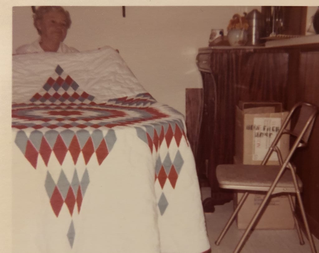 These stories were all I ever had of Grandma Bullock until a package arrived from home with a red, white and blue lonestar pattern quilt inside. My mother said the quilt was easily more than forty years old. It was used as a table cloth which expalined many of the stains on the white fabric. I didn't pay any attention to them though, because I couldn't get over the bright colors and even stitches.