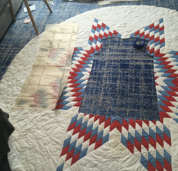 I would only have have one chance to cut the quilt. I spent hours moving my pattern pieces around to find the perfect layout for my coat. The back of my coat would be the middle of the star. The front and the sleeves were harder to place. The quilt wasn't evenly stained so I tried dozens of placement combos to find one I loved.