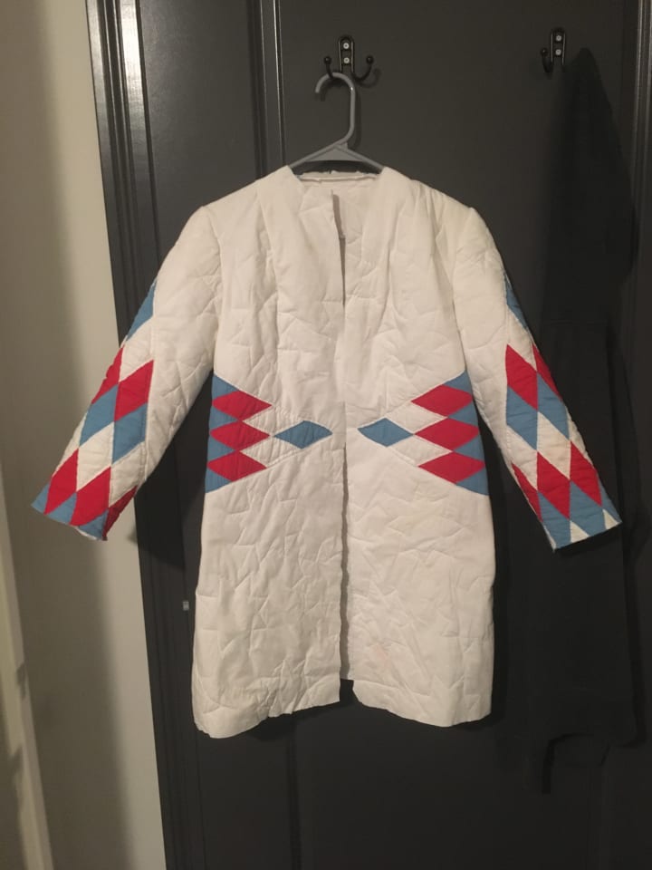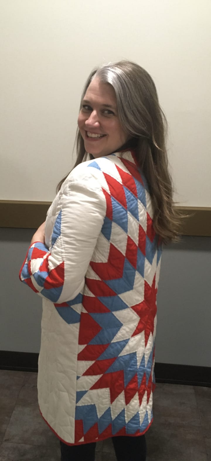 The final step was to add the red binding from the quilt edge to the coat. I sewed the first side by machine and then closed the binding by hand, as Grandma Bullock would have. Holding that same fabric in my hands that she once held. Adding my stitches to hers was powerful, almost like magic or time travel. I don't have memories with her so I stitched new ones together to make a connection to her I can keep for the rest of my life.