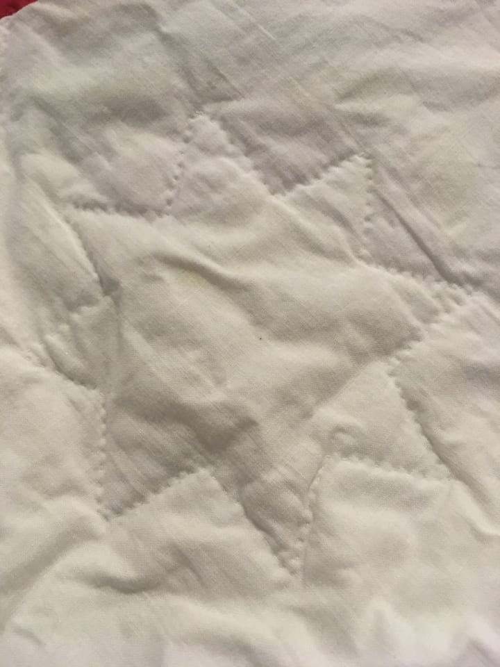 The quilt top was pieced together by hand which must have taken hours. The white part of the quilt top was stitched with eight point stars all over to mimic the star in the middle of the design.