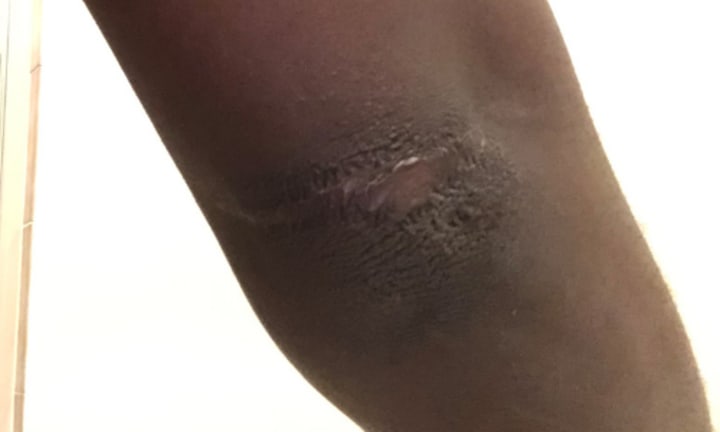 Conspicuous, but not imposing. It bears more mystery and love than a Jane Austen novel. Like a vine wrapped around a tree, it’s plastered across my elbow. Ominous to those who don’t know the love that came with it. It is a scar that captures a memory for you and a love for me.