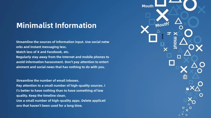 In the era of information explosion, we are surrounded by massive amounts of information every day. However, excessive information input not only consumes our time and energy but may also lead to distraction and confusion in thinking. Therefore, minimalist information is particularly important. By streamlining the sources of information input, reducing the time spent on social networks and instant messaging, and taking regular breaks from the Internet and mobile phones, we can effectively avoid information harassment and protect our attention and thinking space. At the same time, focus on a few high-quality information sources to ensure that the information we receive is valuable and meaningful.