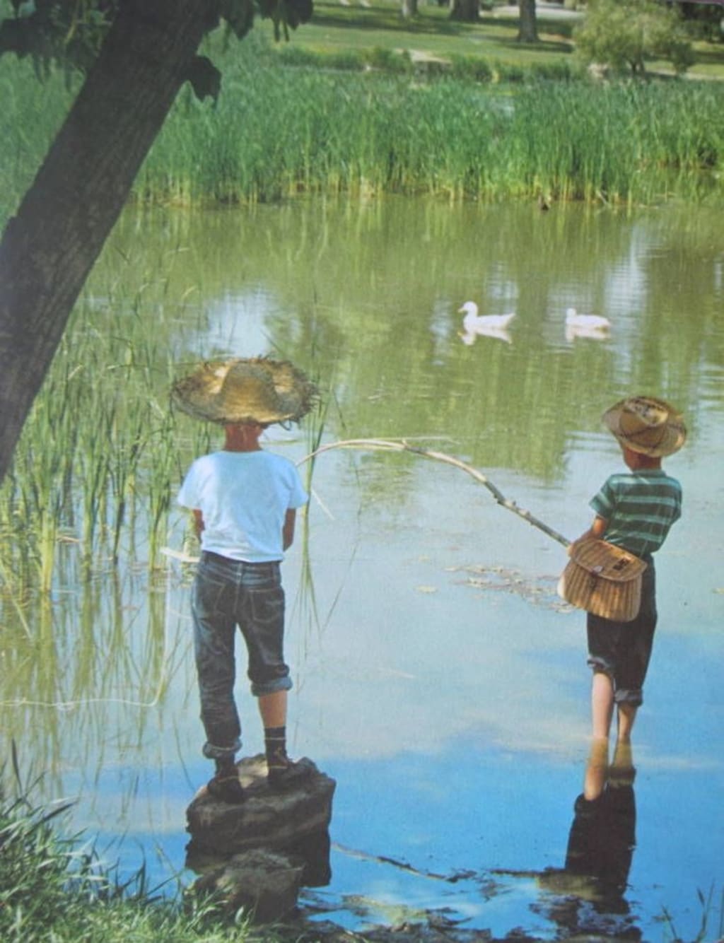Because of the configuration of the eaves, our beds needed to be put on opposite walls, where the walls angled in, so you’d hit your head if you walked in those areas. With the beds in those spots, only if you stood up or jumped could you whack your head on the wall. The wallpaper had the boys of summer fishing and they silently watched as Chris and I grew.
