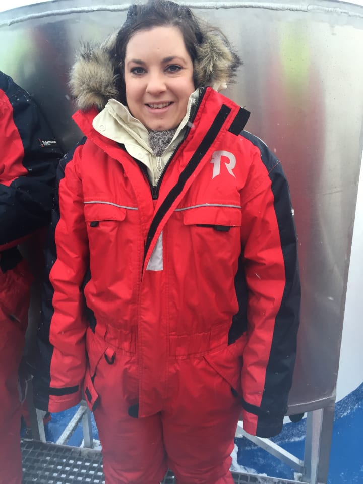 When we got on the boat, we were given these lovely warm overalls because it was freezing. However, my husband, Connor started to feel like he was over heating. We sat down at a table while we headed out into the sea and all of a sudden, Connor jumped up and started stripping off his overalls. Then, to my utter disgust and embarrassment, he vomited everywhere and I mean everywhere. I thought, "trust me to have a husband who suffers from sea sickness!"