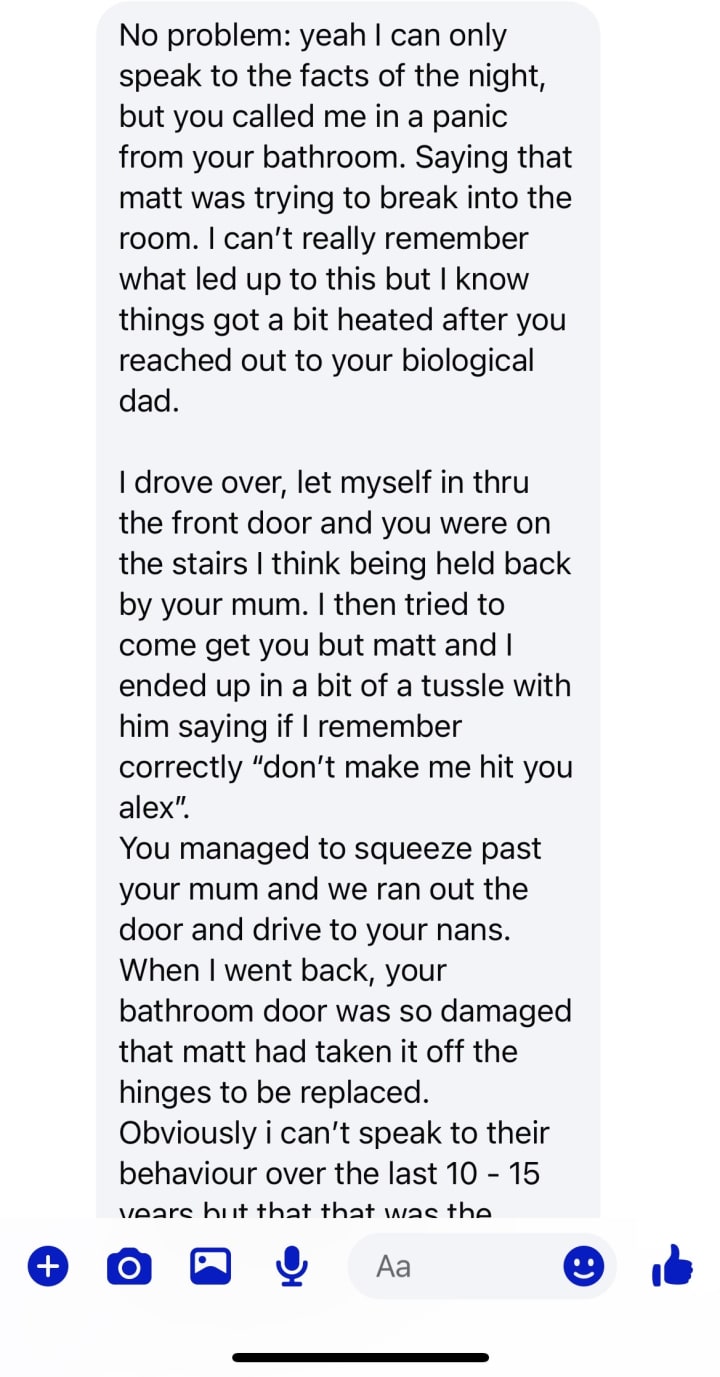 I didn't read the whole thing but I haven't read that little, I also read the text messages or at least most. I'm so sorry you've bern through this. It's a nightmare. Personally I was being verbally abused and then my dad said that "he didn't mean to" and that they "love me". It's a horrid thing to go through, and I'm glad that you disconnected with them and took care of yourself ♥️