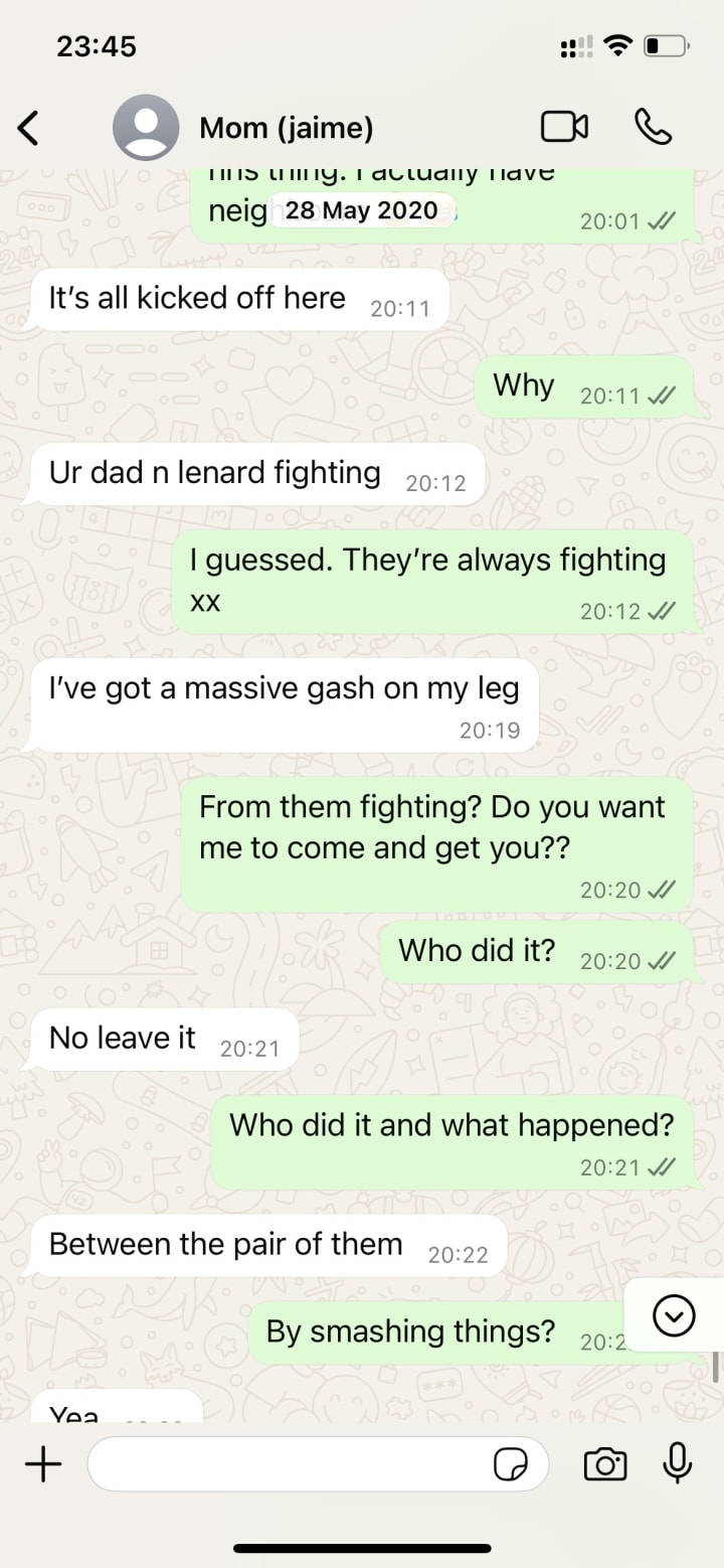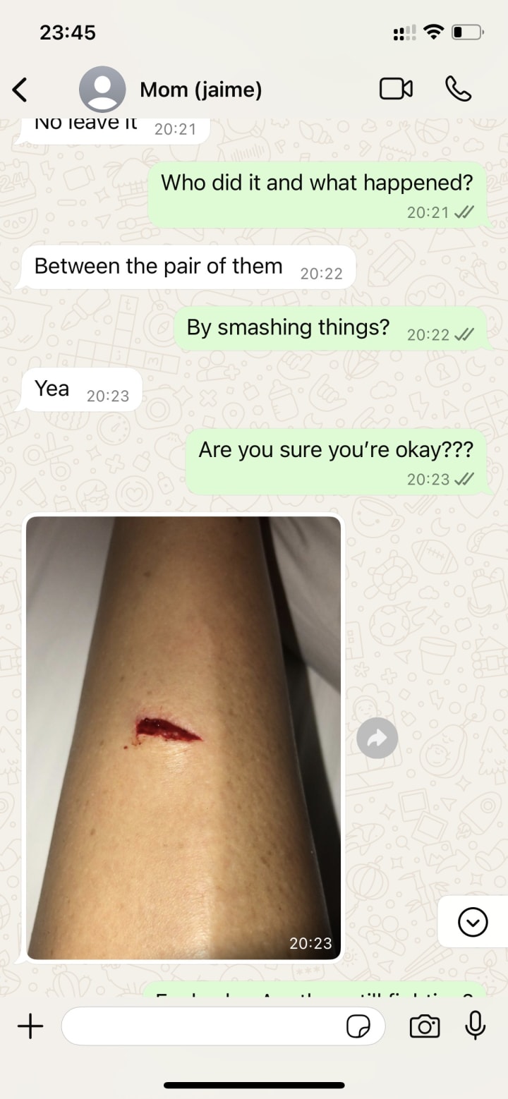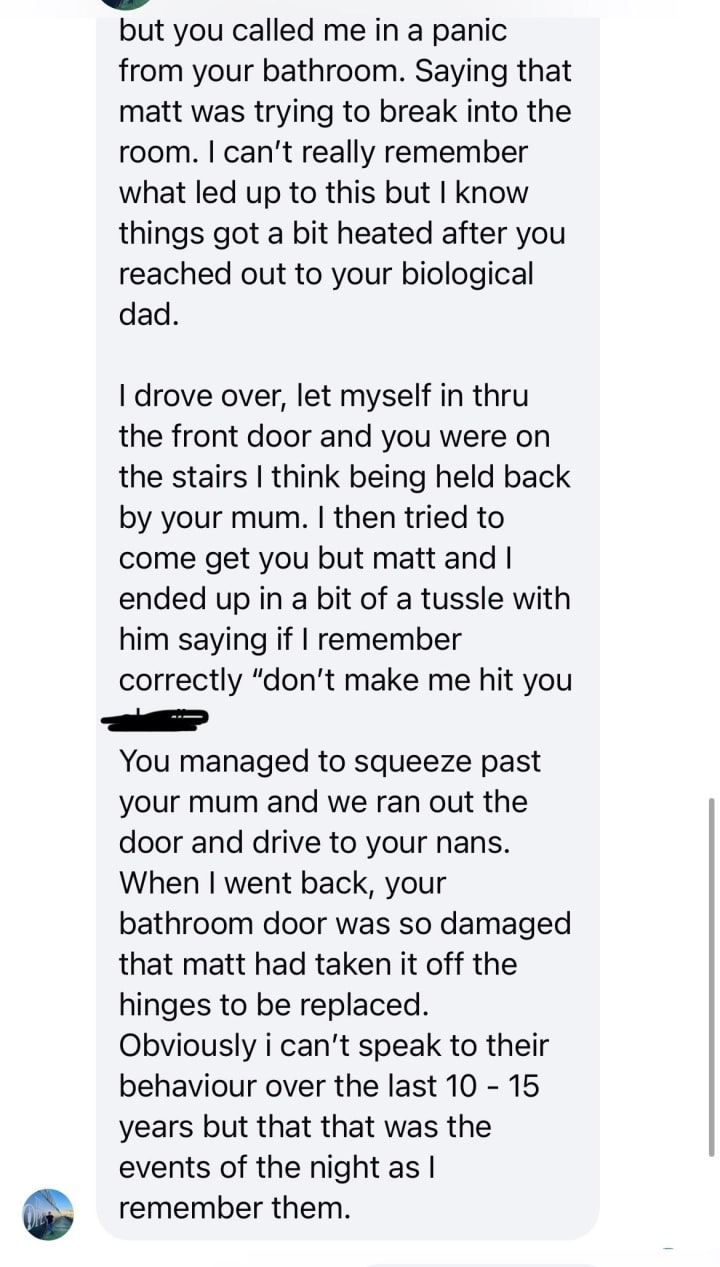 To my knowledge, she wasn’t physically abused while I lived there. I believe this message was about an argument where she got caught between my stepdad and brother, and they started throwing things at each other.