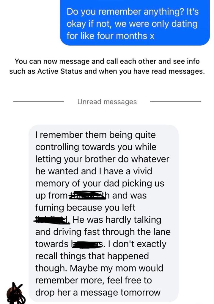 Before writing this, I reached out to that boyfriend (we hadn’t spoken in 12 years) to ask if he remembered what happened that night — and anything else he had witnessed.