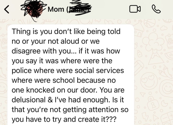When you’re hiding abuse to protect your mom or because your stepdad is the only financial support in the house, you don’t have many witnesses. You isolate yourself — by design. It also didn't help that my Mom would tell me that other family members were saying awful things about me behind my back, and for a long time I blindly believed her.