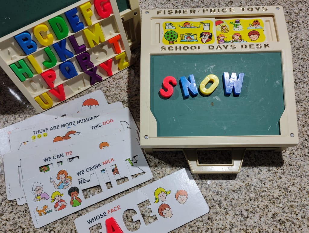 SNOW was the first word I recall learning to read. I was around three years old in the early 1970’s and had a wonderful contraption called a Fischer Price school desk. It had large cards with holes in them that the chunky, plastic alphabet letters that are still stuck to refrigerators all over America today, nestled into perfectly. Each cutout card spelled a three-to-five letter word and had a simple sentence and picture to match drawn upon the face of the card. The SNOW card was my favorite. Living in southern Louisiana at the time, snow was not something I ever remembered experiencing first-hand. Something about the smiling snowman in his warm scarf and hat looking on as children played with their dog in the falling snow and deep drifts always made me long to play in the snow. I can close my eyes and picture that card with the letters so lovingly placed in the holes. It’s one of my earliest memories and is as clear as the day I first played with the cards.