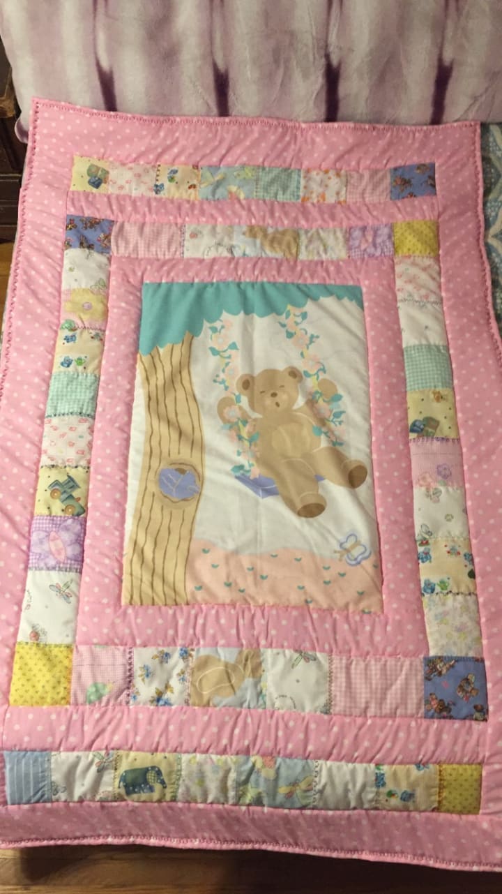 Going to the fabric store is one of my favorite parts. Walking through the isles of fabric stacked high towering above me. There is a specific section in my favorite outlet that has baby patterns printed on cotton fabric. I pull out multiple heavy rolls and stack them by each other and I look and picture what I can do. I group them together making sure the colors go with each other. I start to picture what I want in my head. I give them to a worker who measures them out and cuts me yards of possibilities. I pay for my new pieces and get them straight to the wash. Depending what I get I usually try to find my centerpiece. What do I want to be the focal point? For one of my last projects I had bought a panel of a teddy bear swinging from a tree. I used that as a centerpiece and created a polka dot border my cousin had chosen.