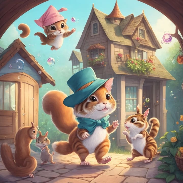 Last but not least, there was Sparkles the Squirrel, a jittery critter with a passion for acrobatics. Sparkles swung from the chandeliers, twirling and flipping in the air. Whisker, inspired by the daring antics, attempted his own somersault but ended up tumbling headfirst into a pile of forgotten books.