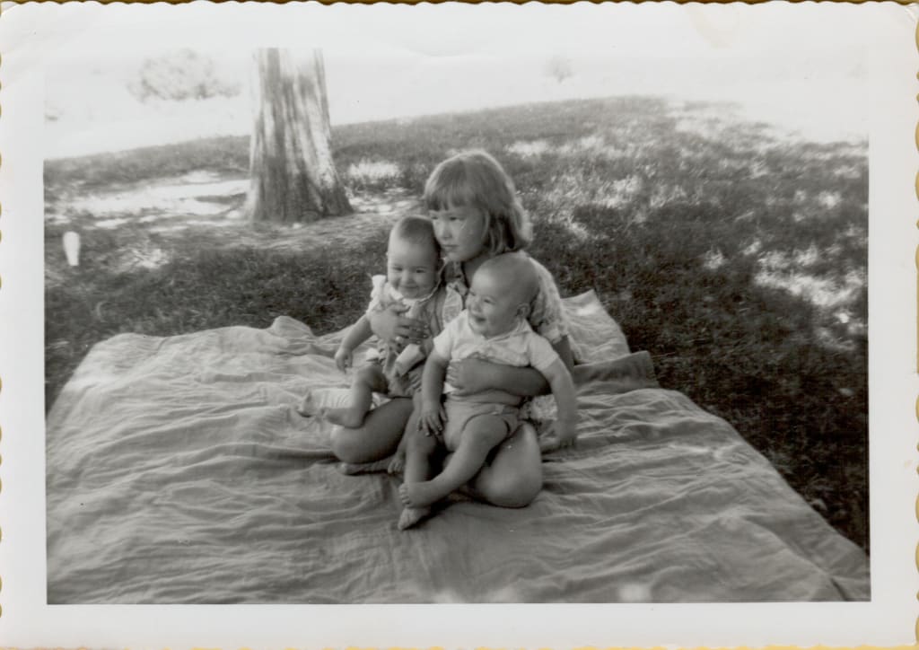 Feb 6,1957 The smell of coal smoke permeated the warm school house as my teacher, Mrs. Walker, led me to the side door nearest my first grade classroom. She was nervous and shaking. As I looked out the glass pane wondering why she had brought me here, she leaned down to my level, “Your mom has just gone to the hospital. She won’t be gone too long and she’ll bring back your babies.”