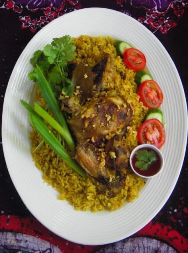 Fry garlic, curry powder, canola oil, lemongrass powder, bay leaf and galangal powder along with rice. Blend well and put a ripe chicken in the middle of the rice cook for 30 minutes.