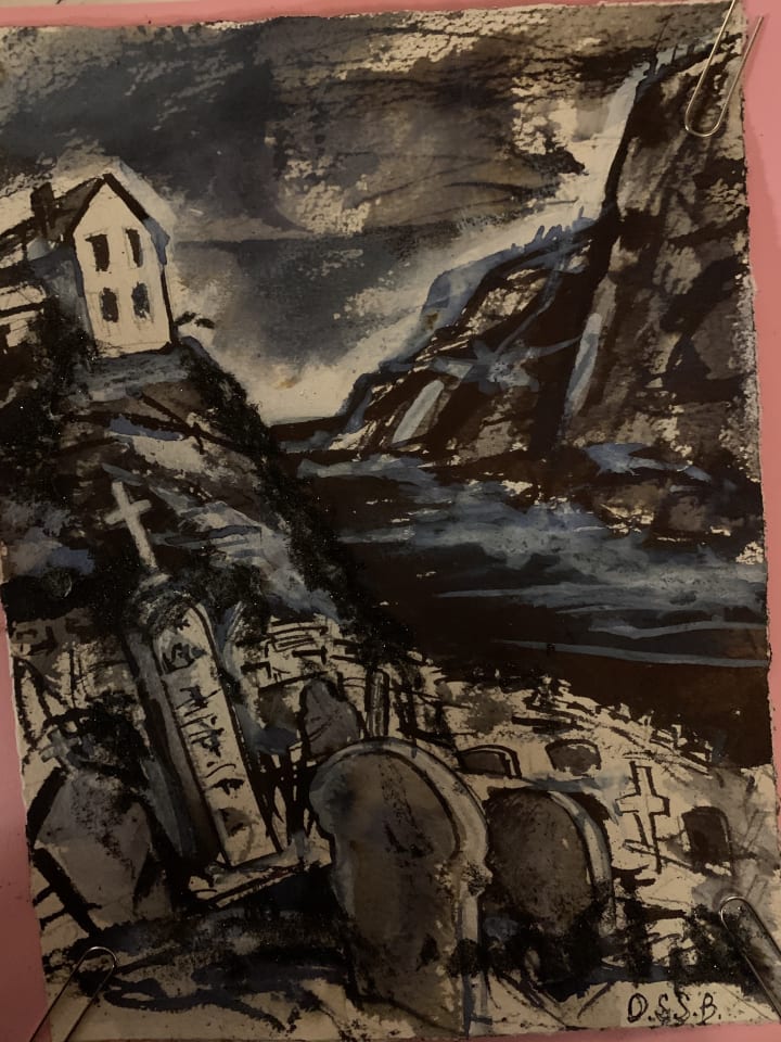 Drawn toward the battered blue wood, how out of place it seemed-the walk less than a minute, past artificial flowers blown around helter skelter, overgrown alders, down a rock-hewn path, further on-a majestic cliff face beckoned.