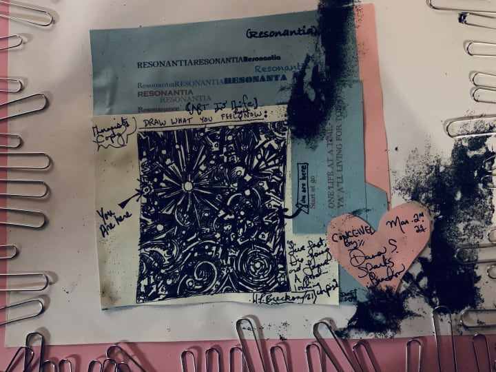 Entering her small spare bedroom, against every wall an overstuffed bookcase. Instinctively, her eyes were drawn toward the tiniest one next to a bay window. Scanning it closely, sitting there on the top shelf, standing out from the colourful spines she spotted a black notebook never before noticed. Taking it down gingerly, her hand shaking, with a deep inhale she set it on the table next to the settee. Steadying herself, she sat. Then thunderously unable to restrain herself a second longer grabbing it wholeheartedly, whipping open the ornately decorated front page. For there was only one. Page. The rest had been ripped asunder with an envelope placed inside instead. Holding it together was a tidy frayed rubber band.