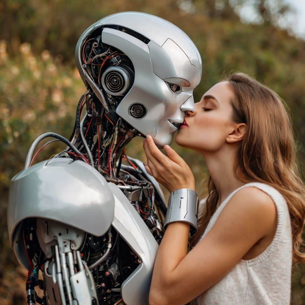 Robot and woman kissing