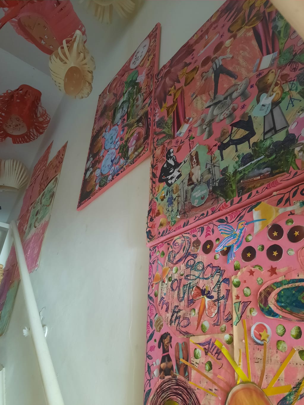 The cutting went on, the playing went on, more players meaning more stories until the day I started cutting images of wall papers and thunder struck! We couldn’t change the colours of the wall by painting them but what about a temporary wallpaper? I had suddenly flashes of teenage bedroom. All the colours, the entire world really was there, bursting out of the wall, barely contained by mismatched pins, and fuelled by dreams still daring to be big.