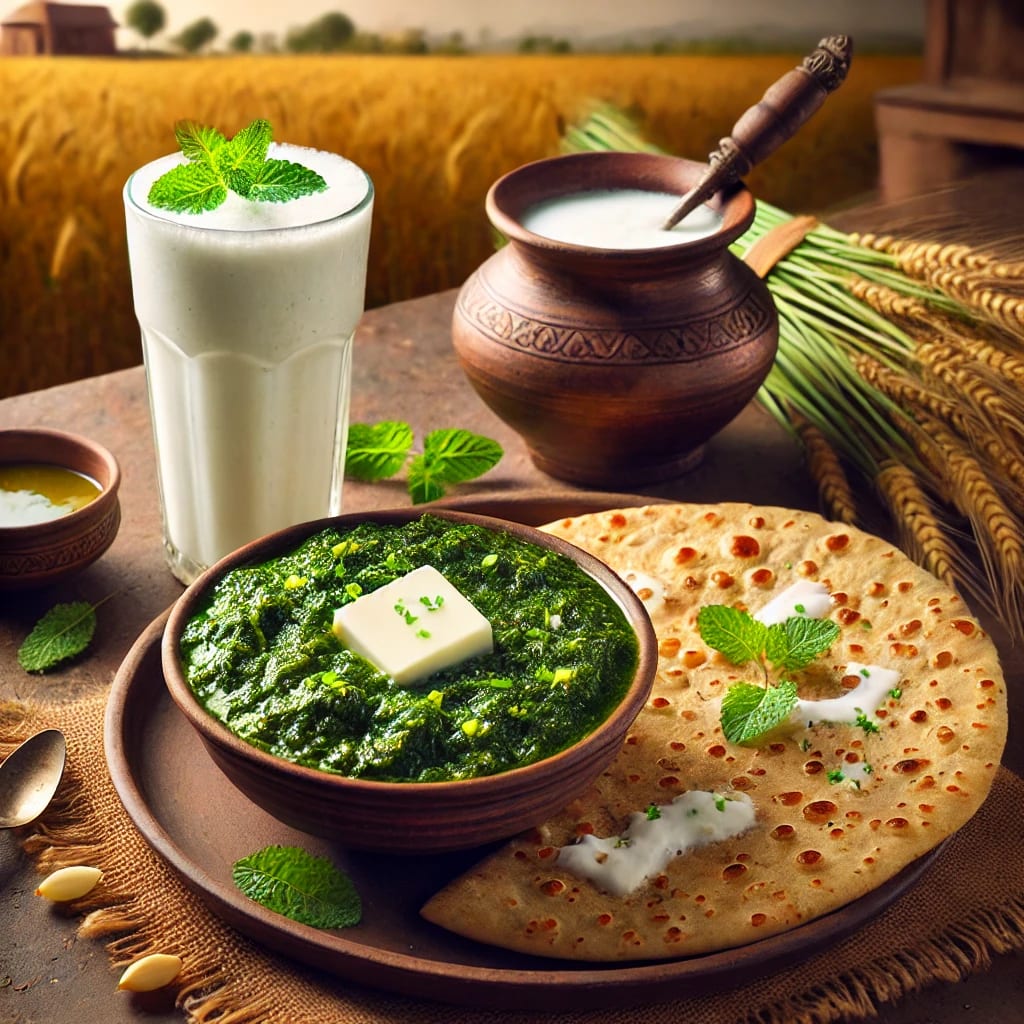 During the spring season, when the **mustard fields turn golden yellow**, everyone starts preparing **saag**. **Women in Punjabi households wake up early, pluck fresh mustard leaves, wash them thoroughly, and cook them with love.** This is not just about food; it is **a symbol of unity**—where families sit together, eat saag and makki di roti, and share warmth and love.