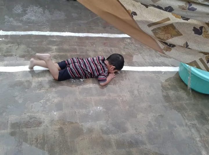 I was observing and trying to figure out why my husband looked distressed; I was amazed at what was happening in our home. Suddenly, my husband saw Mustafa lying down the stairs; perhaps, while hopping around, he had fallen and now was crying hysterically.