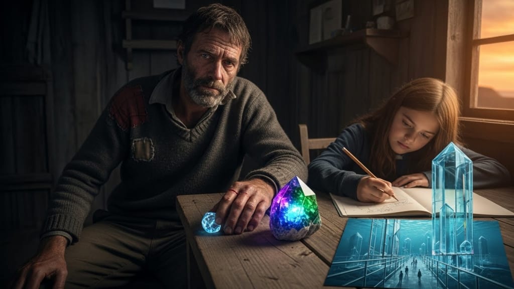 Later, back in the shack, the crystal sat on their small wooden table, catching the last orange rays of the setting sun, bleeding color into the dim room. It pulsed, a silent, beautiful promise. Lena sketched furiously in her worn notebook, her pencil moving with quick, precise strokes, depicting the glass towers, the silent streets, the impossible beauty her father had described. Elias watched her, the heavy ache in his bones a constant companion. He knew the crystal meant medicine, maybe even a new lamp, but it also meant another dive, another day, the cold, crushing weight of the ocean, the sharp, glittering danger of the city below. He reached out, ran a thumb over Lena's hair, a quiet, rough blessing. She leaned into his touch, her eyes still on the page, drawing the deep, drawing the shimmer, drawing their impossible life.