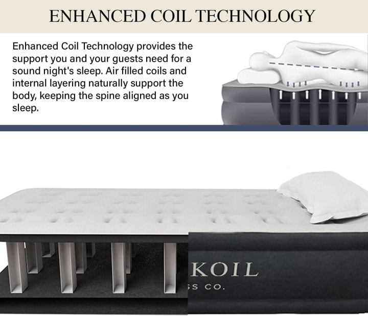 The King Koil Luxury Twin Size Air Mattress is a high-quality airbed that is designed for maximum comfort and support. It features a soft flocking layer and a built-in pillow, providing a luxurious sleeping experience. The mattress is constructed with coil-beam technology, providing spinal support and promoting good sleeping posture. The sueded top keeps bedding in place, and the extra thick waterproof comfort quilt top ensures a comfortable and dry sleeping surface. The built-in 120v / 210w AC pump allows for fast and easy inflation and deflation, reaching full inflation in just 90 seconds. The mattress is perfect for in-home use, overnight guests, camping trips, and more. The King Koil mattress comes with a customer-friendly 1-year warranty, and all air mattresses include patch kits should they accidentally puncture or tear. The mattress is also endorsed by the International Chiropractors Association for promoting proper spinal alignment and a healthier night's sleep.