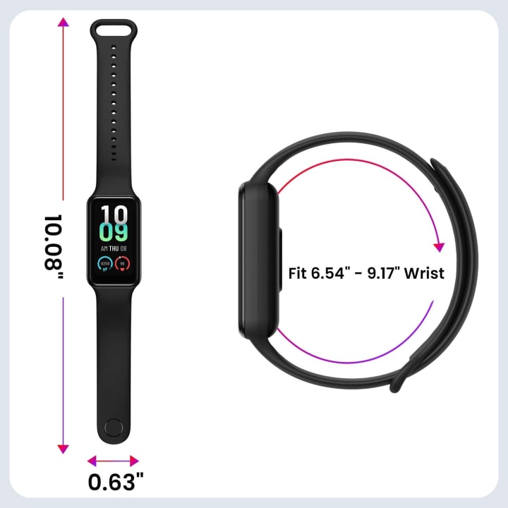 The Amazfit Replacement Band for the Amazfit Band 7 Fitness Tracker is the perfect accessory for active individuals who want to customize their fitness tracker. Made from soft and comfortable TPU material, the strap is suitable for various activities like workouts and swimming. It is compatible with wrist dimensions of 6.54-9.17 inches and comes in four color options - Green, Blue, Pink, and Orange - allowing you to personalize your style. The band measures roughly 10.08 inches in length and 0.63 inches in width, providing a comfortable and secure fit. Upgrade your fitness tracker with the Amazfit Replacement Band and stay active in style!