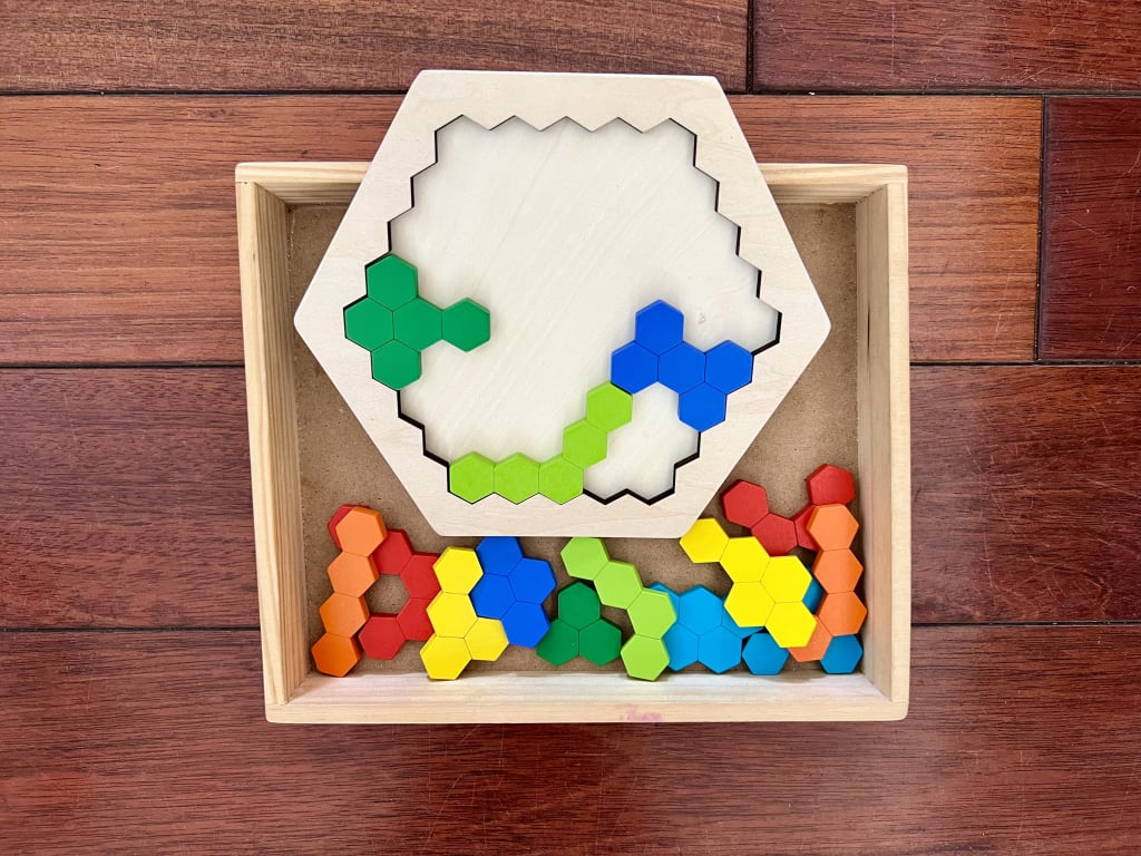 3. TANGRAMS/GEO PUZZLES: These are fancy names for abstract shape puzzles like the one pictured above. These are the 'creme de la creme' of spatial reasoning! They require a little more creative thinking and problem solving that a traditional jigsaw and often can be solved multiple ways which is fantastic for developing fluid reasoning. They can be challenging and may cause some frustration at first, and that's ok. Supporting your child while they experiment with this type of puzzle is definitely worth it.