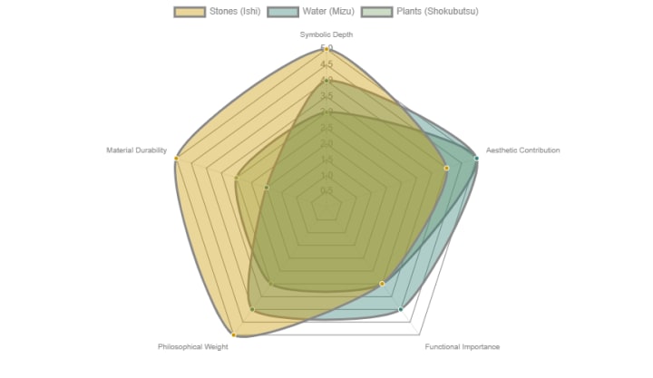 The radar chart above illustrates the perceived significance of various elements in a Japanese garden based on their Symbolic Depth, Aesthetic Contribution, Functional Importance, Philosophical Weight, and Material Durability. As shown, Stones (Ishi) rank highest in symbolic depth, philosophical weight, and material durability, underscoring their foundational role. Water (Mizu) excels in aesthetic contribution and functional importance, while Plants (Shokubutsu) contribute significantly to aesthetics and philosophical reflection through seasonal changes.