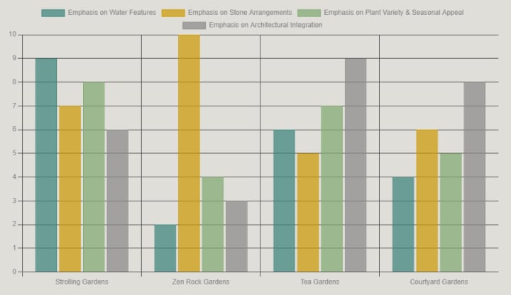 The bar chart above illustrates the varying emphasis of key elements across different types of Japanese gardens. Strolling Gardens, designed for visitors to walk through, show a balanced emphasis across water, stone, and plant features, alongside architectural integration. Zen Rock Gardens heavily prioritize stone arrangements, where raked gravel symbolizes water. Tea Gardens place a high emphasis on architectural integration, notably tea houses and water basins, alongside specific plant selections. Courtyard Gardens, often smaller, still incorporate all elements but with a more concentrated emphasis on architectural features and stone work due to space constraints.