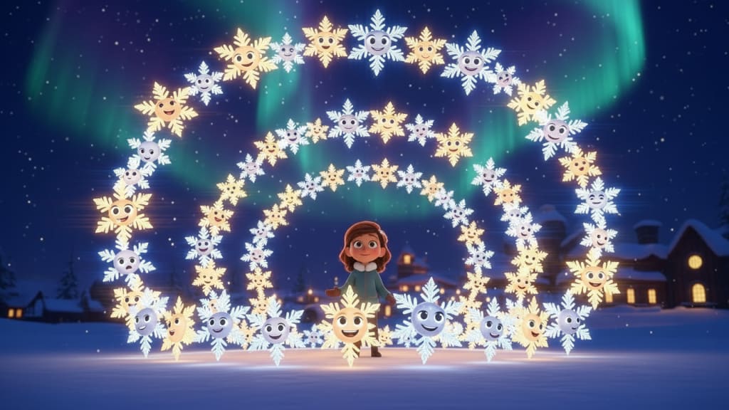 And since that day, it is said, the light snowflakes of the North Pole never fight anymore. Sometimes, when you look carefully at the winter sky, you can see them dancing together, shining with a thousand lights, reminding everyone that it is together that we illuminate the world.