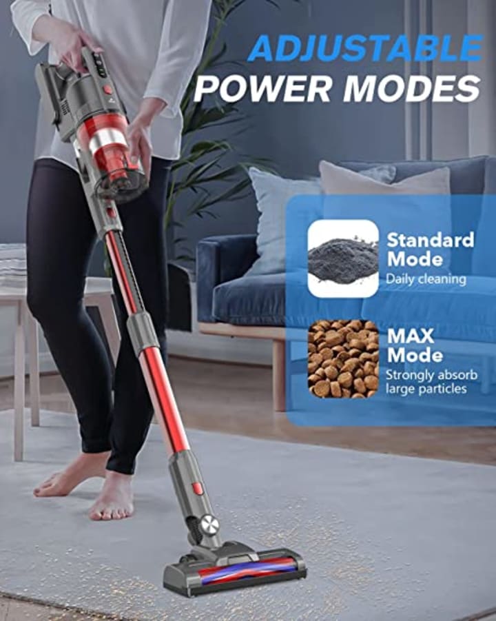 The Fykee Cordless Vacuum Cleaner comes with adjustable modes, allowing you to choose the setting that best suits your needs. It has a suction power of up to 9 kPa and a detachable battery that can last up to 35 minutes on a single charge.