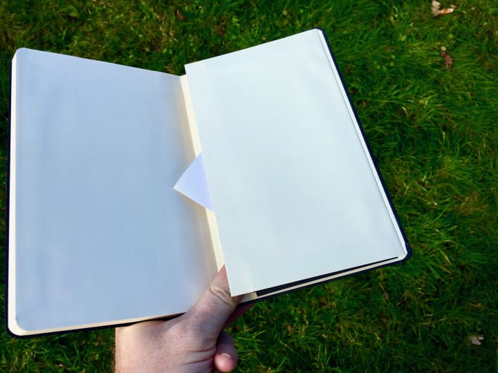 I picked up the notebook from the grass and flicked through the blank pages. I didn’t know what to write in this book, my book. I got to the back and found that hidden pocket and realised I hadn’t looked inside it. There was usually a little booklet about the history of this design of notebook – part of their charm, the association with great creatives and writers for many years. It looked flat and empty this time, the booklet already having found its way to the recycling perhaps, but as I prised the pocket open, something slipped towards the spine where I could get hold of it.