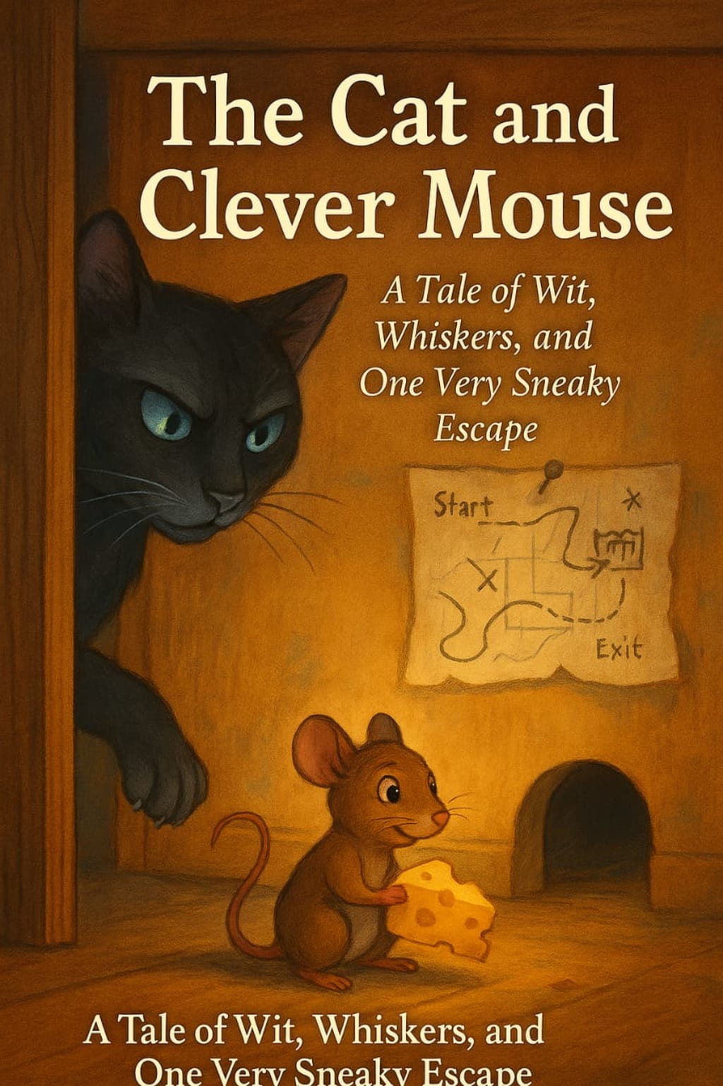 In a quiet little village nestled between green hills and blooming meadows stood an old, creaky farmhouse. Its wooden shutters rattled in the breeze, and its chimney puffed out little clouds of smoke during winter. This was no ordinary house—it was home to many secrets, many tales. But none quite as thrilling as the clever rivalry between a proud black cat named Whiskers and a witty little mouse named Nibbles.