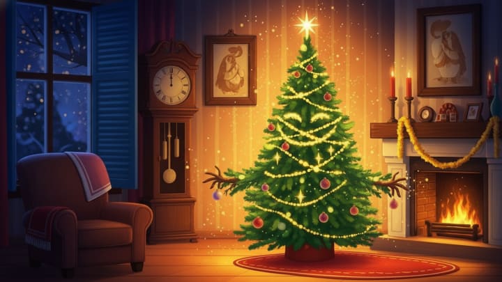 That year, the fir tree was particularly beautiful. Tall and majestic, its branches opened like arms ready to welcome all the decorations in the world. Dad set it up in the middle of the living room, near the big window that looked out onto the sleeping garden. For an entire afternoon, the family lovingly decorated the tree. Mom hung golden garlands that shone like rivers of light. Dad hung small red, green, and silver baubles that tinkled softly when brushed. And Léonie, standing on a small stool, placed the sparkling star at the very top, the one that had belonged to her grandmother long ago.