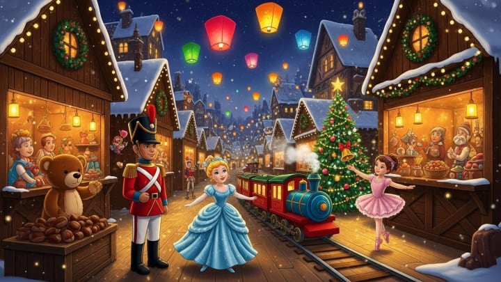 The tree continued on its way and soon discovered an incredible sight: a Christmas market like no other anywhere else. Small wooden chalets lined up along a square covered with fresh snow. Lanterns of all colors floated in the air with no one holding them. And everywhere, everywhere, toys came to life!
