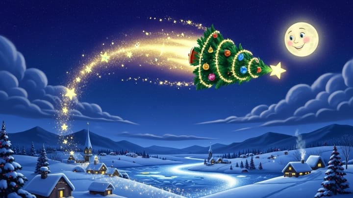 It was floating. Like a small luminous comet, the tree rose, rose, rose into the starry sky. Its garlands left behind a trail of golden light that illuminated the night. Below, the world slept peacefully under a blanket of snow. The tree could see the roofs of houses, church steeples, frozen rivers that shone like silver ribbons. It was magnificent.