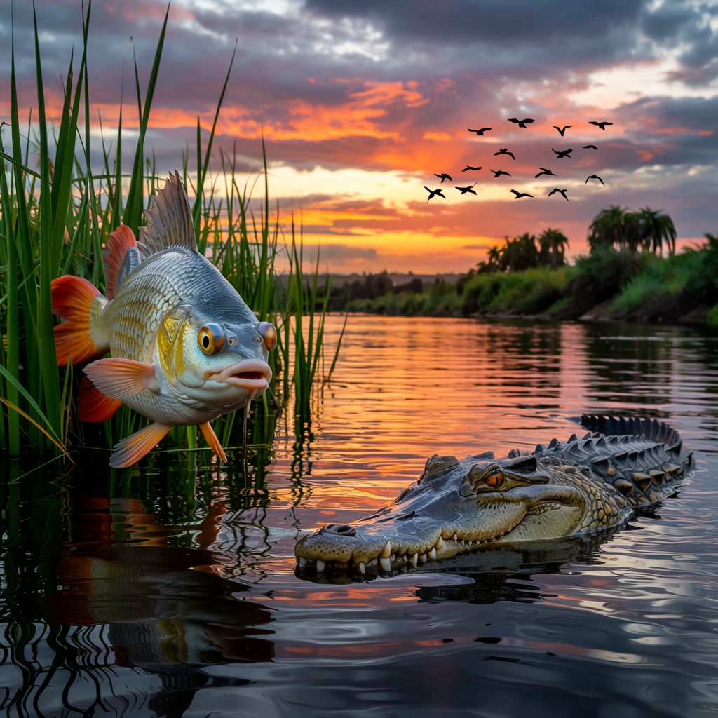 As the sun dipped low, the river's surface turned to molten gold. Fin darted among the weeds and rocks, his silver scales flashing. Cragtooth, with slow and deliberate strokes, began to pursue.