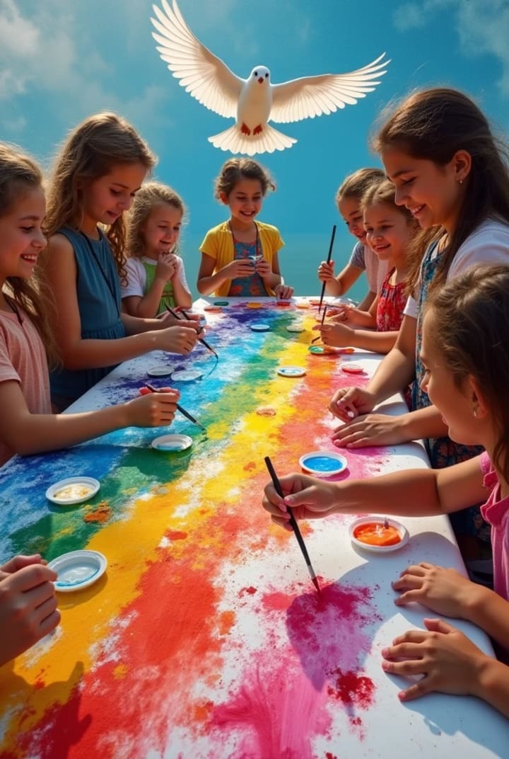 Children gathered around, dipping their brushes into every color they could find. One girl painted a dove flying over the world. A little boy drew hands of all colors holding each other. Another child painted a rainbow stretching from one heart to another.