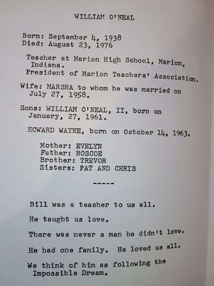 In his coffin, there was a heart-shaped pillow beside his head that said Fa. The mortician did the best he could, considering my dad's injuries, but Bill O'Neal the 1st looked horrible.
