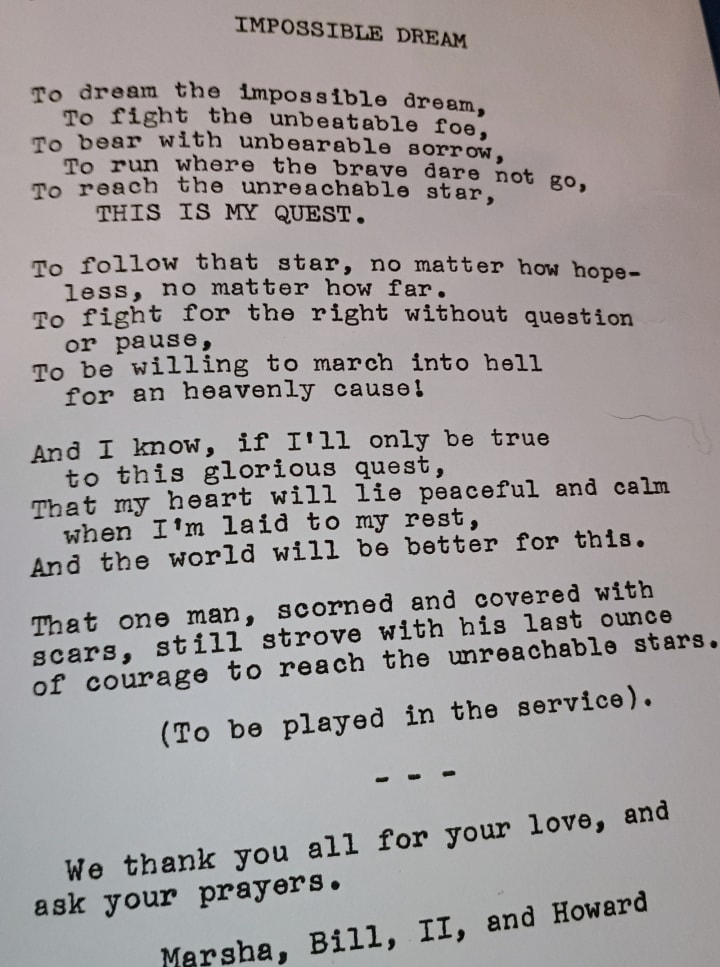 And then I told him that The Impossible Dream was my dad's favorite song. My mom had that song sung at dad's funeral.