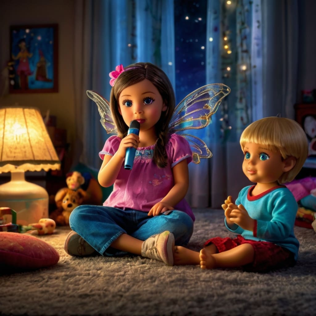 Suddenly, the Barbie doll jumped down gracefully from the shelf and landed on the glass-top center table in front of them. In her little hand, she held a shining microphone, from which a soft beam of light radiated, brightening the room.