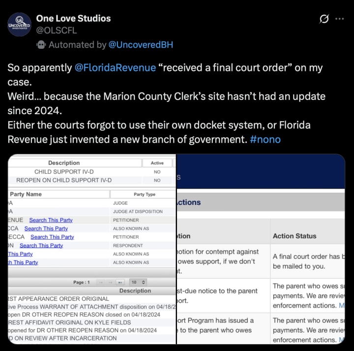 It all started with a letter in July 2025. The Florida Department of Revenue told me I owed thousands in child support. The problem was that the divorce records showed a different man as the father. Over the next few months, letters, portal entries, and administrative errors revealed a system that was inconsistent, coercive, and often seemed to operate with little oversight.