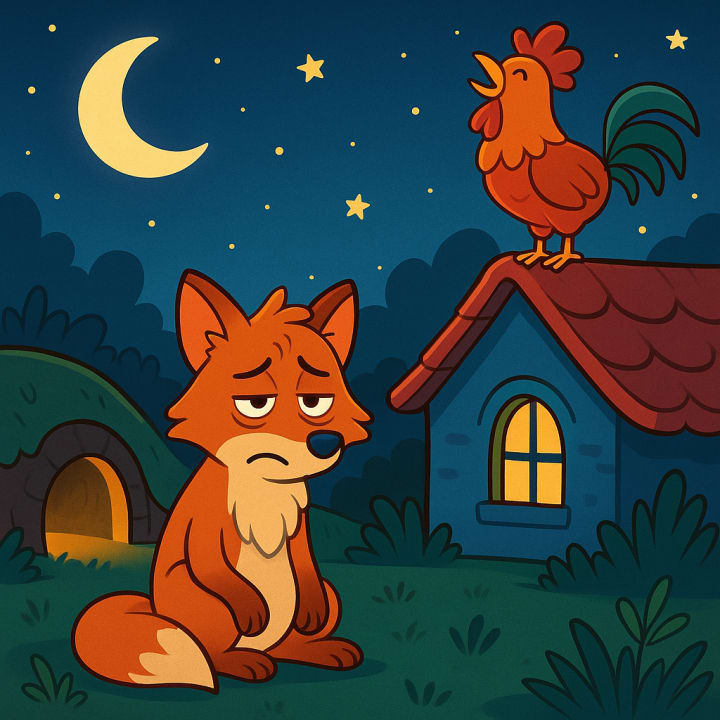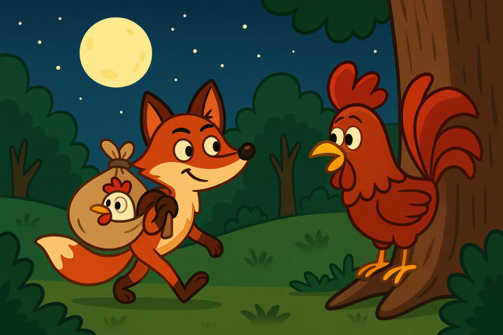 So when darkness fell and the stars filled the sky, the rooster stayed awake, hiding behind the bushes near the coop. The dog was already snoring, and soon enough, the fox appeared—soft steps, bright eyes, and that same sly grin. He grabbed a hen and trotted off toward the forest, his tail swinging proudly. The rooster followed quietly, careful not to make a sound.