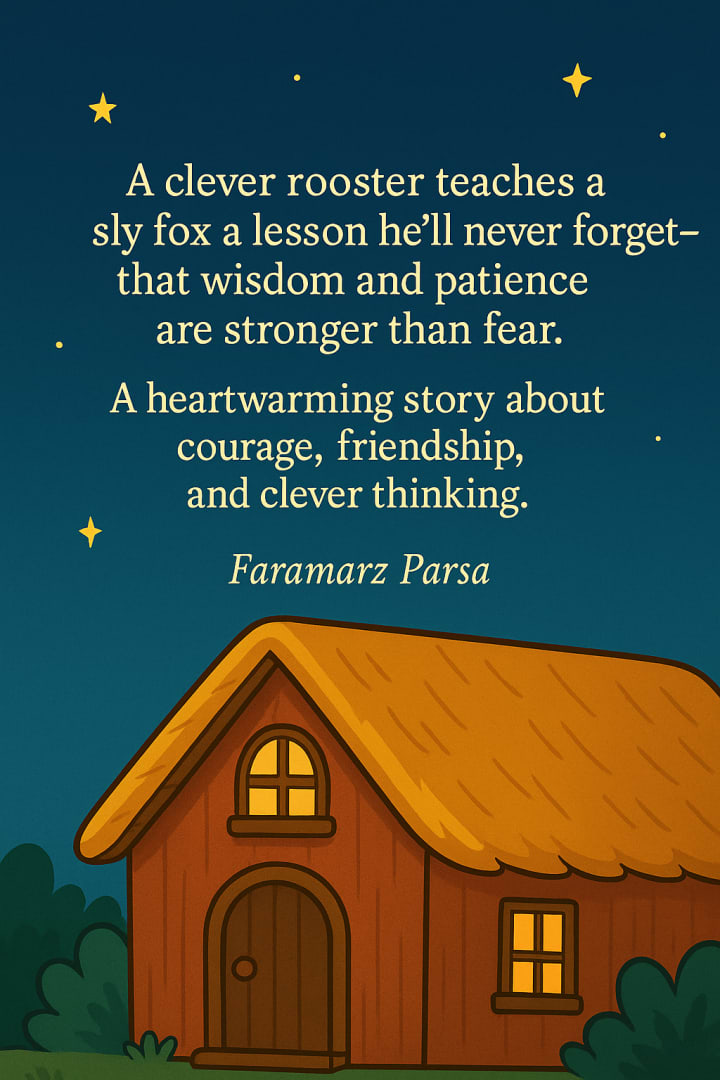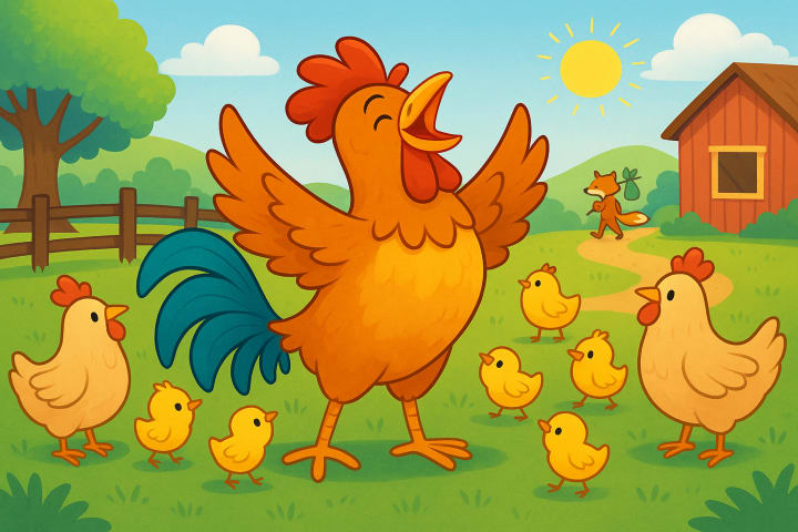 🔹 A clever rooster teaches a sly fox that wisdom always wins over strength.