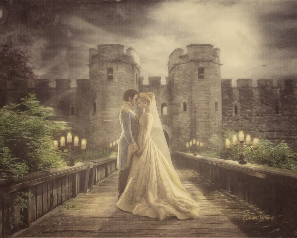 Cateline led the family’s procession through town and to the church. A group of minstrels filled the air around them with the twittering of flutes and the plucking of their lyres. Once at the church Cateline took her place next to the groom on the church doorstep before the bishop. She kept her eyes on the stones under her feet, barely whispering her vows when her turn came. When her groom begin to repeat his vows after the bishop, his voice sounded familiar. She peeked up at him and he was looking back at her with a quiet smile on his face. But, what caught her attention were the color of his eyes, one blue and one brown. She looked up a few more inches and saw his crown laden with emeralds and diamonds sparkling in their silent eloquence. Her heart leaned into his and when they stepped off the church doorstep the late afternoon sunlight cast a golden glow on their path.
