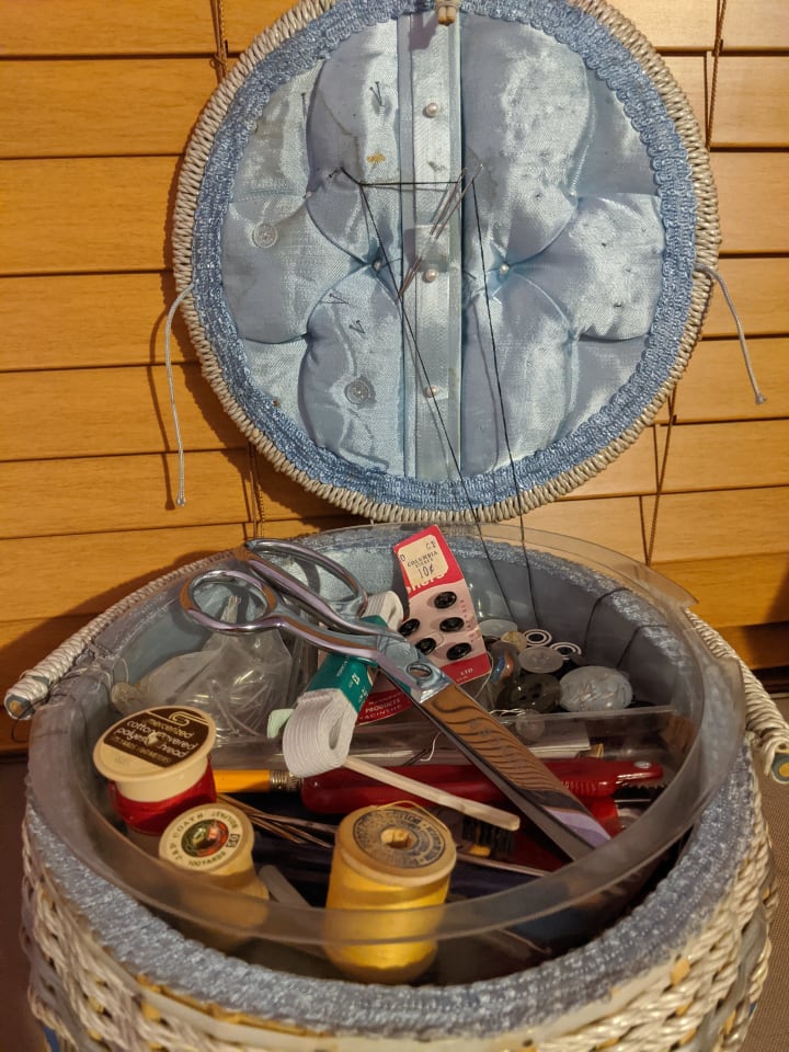 Sneaking into her bedroom, where the Singer sewing machine was always set up, I loved to open the round wicker blue and grey sewing basket filled with so many wonders. While she was well occupied making us a delicious dinner, I would carefully lift the shiny silver blades, admiring the warped reflection of my tight curly hair and guilty face in the contours of her most prized tool.